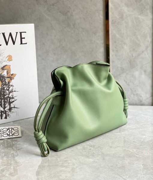 Loewe signature “Flamenco” clutch bag in soft, supple napa leather. Adjustable/detachable shoulder strap. Coiled knot drawstring and hidden magnetic closure.